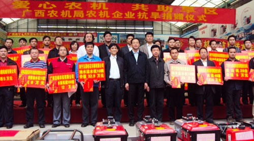 2010年4月1日,两辆身披“科丰农机助旱区人民战胜旱灾”、“一方有难 八方支援”、“响应政府号召投身抗旱前线”的红色横幅,装载着价值80000多元的微耕机等科丰牌系列农机具,带着科丰公司全体员工对广西旱区受灾群众拳拳爱心的科丰抗旱赈灾物资车,正整装待发地朝着广西农业装备展示中心方向驶进。