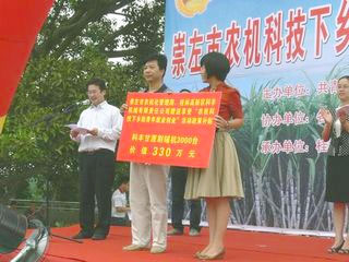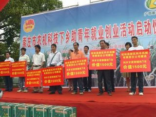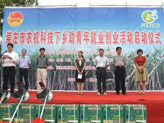 2010年9月15日上午十点,崇左市农机局联合共青团崇左市在火车站广场举行农机科技下乡助青年就业创业活动启动仪式。市委组织部钟畅姿部长出席,市农机局徐朝松局长、张景志副局长、来承钦副局长,市团委冯明春副书记、卜精春副书记,桂林市高新区科丰机械有限公司负责人列席,崇左市各县(市、区)农机局局长、团委书记、首批享受“农机科技下乡助青年就业船业”政策的创业青年代表、青年致富带头人、江州区创业青年代表队、各经销商代表、广西理工职业技术学院学生会代表共200多人参加。