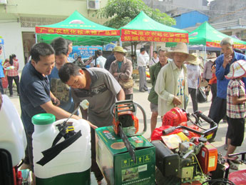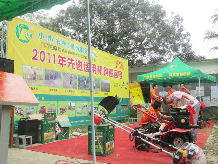 此次活动特邀了广西桂林高新区科丰机械有限责任公司、广西五菱南宁桂花车辆有限公司、广西柳州五菱柳机动力有限公司等10家农机生产企业,组织36名技术人员和13辆宣传大蓬车,带上手扶式水稻插秧机、微型耕整(作)机、小型植保机、背负式水稻(甘蔗)收割机、手提式电锯等11个品种46台套(件)先进适用农机具、各种宣传资料等,以防城区的华石镇为宣传展(演)示始点,分别到了峒中镇、里火边境村庄、东兴市的马路镇等9个乡、镇(街、村),行程720公里。
